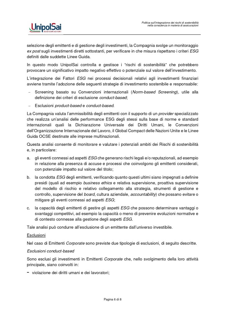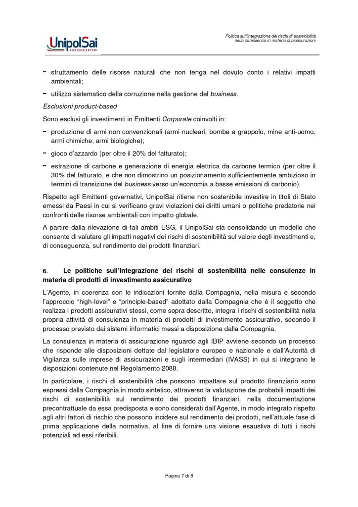 Politiche sull’integrazione dei rischi di sostenibilità nelle consulenze in materia di prodotti di investimento assicurativo.